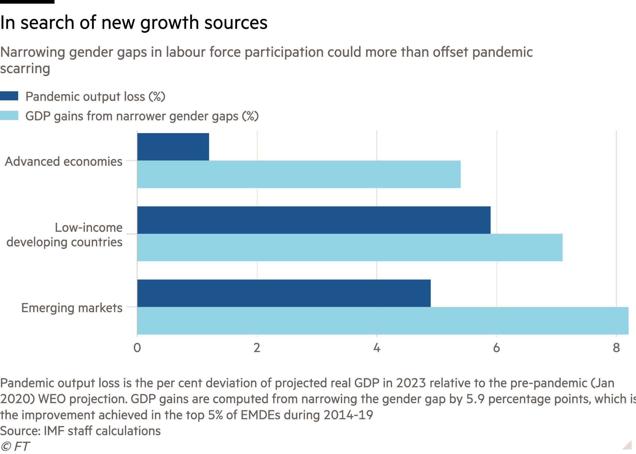 On gender alone, an International Labour Organisation survey from 2017 (updated in 2022) said 72 per cent of men were in employment compared with 47 per cent of women. Last year the IMF estimated that emerging and developed economies could boost gross domestic product by 8 per cent if they raised female labour participation by 5.9 percentage points.