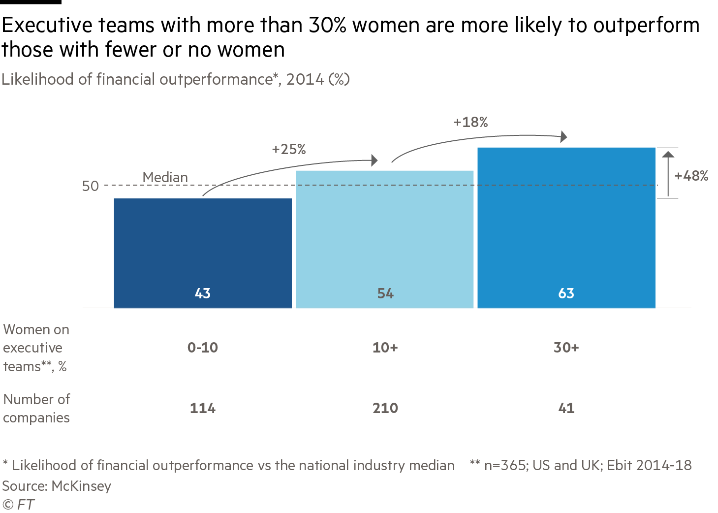 In its fourth study in 2022, the consultancy found that the relationship between diversity at executive level and the likelihood of financial outperformance had strengthened. On gender, it said that companies in the top quartile for diversity were 39 per cent more likely to financially outperform those in the bottom quartile.