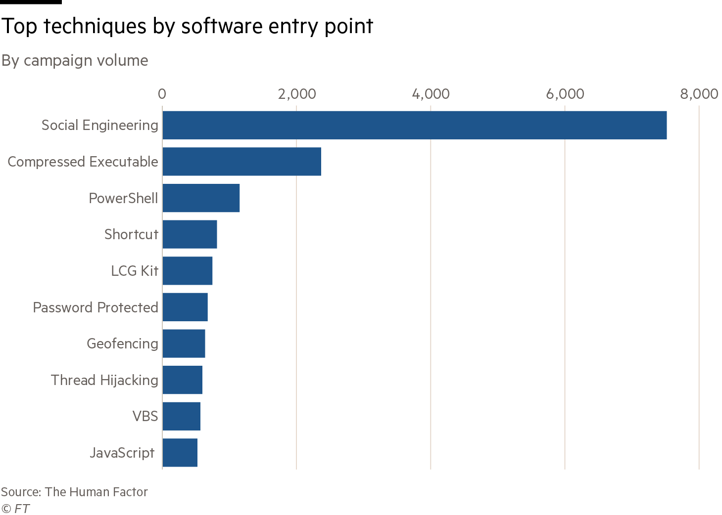 An analysis of 1.7bn emails a day by Mimecast, the security platform, found that typical users at small- and medium-sized companies were twice as likely to encounter threats as those at large companies. Marc van Zadelhoff, CEO of Mimecast, says small companies are easier “drive-by” targets. “Hackers are constantly pinging IP addresses looking for common mistakes – and small and medium businesses just have more of them.”